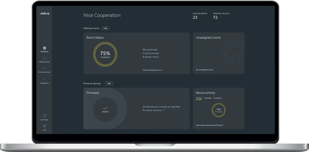 Jabra+을 사용하면 모든 장치를 한 곳에서 보고 관리하고 제어하고 업데이트할 수 있습니다.